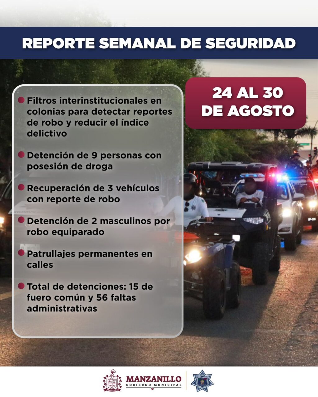 La Dirección de Seguridad Pública de Manzanillo da a conocer los resultados de las acciones operativas realizadas del 24 al 30 de agosto, en coordinación con elementos de la Secretaría de Marina, con el objetivo de fortalecer la prevención del delito y sumar a la construcción de la paz en el municipio.