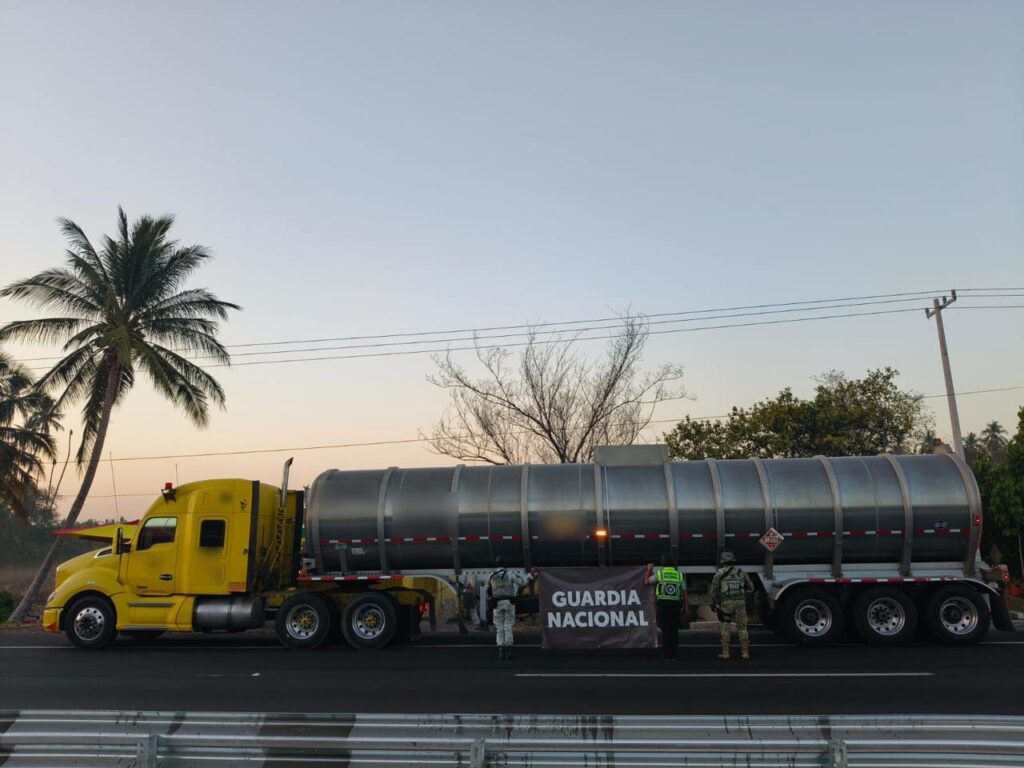 Militares y personal de la Guardia Nacional aseguraron en la Carretera Manzanillo-Colima, un cargamento de casi 45 mil litros de gasolina que pudiera ser de procedencia ilícita, de acuerdo con los reportes donde se asegura que la carga no contaba con los códigos oficiales para el transporte de hidrocarburos.