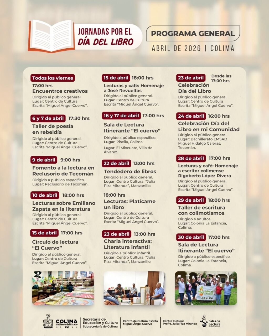 El Gobierno del Estado de Colima que encabeza la mandataria Indira Vizcaíno Silva, a través de la Subsecretaría de Cultura y el Programa Nacional de Salas de Lectura, celebra el Día Mundial del Libro con una programación especial durante un mes de actividades gratuitas, talleres de escritura creativa, charlas, lecturas comunitarias y homenajes a escritores locales y nacionales.