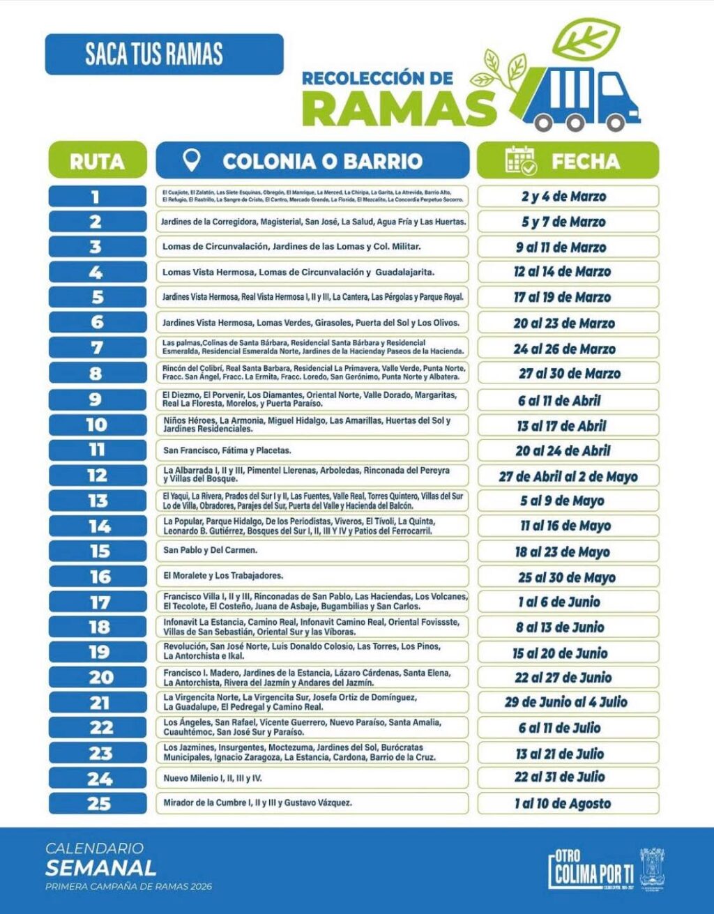 Según el cronograma establecido, del lunes 13 al viernes 17 de abril de 2026, los equipos de recolección de ramas, recorrerán las colonias Niños Héroes, La Armonía, Miguel Hidalgo, Las Amarillas, Huertas del Sol y Jardines Residenciales.
